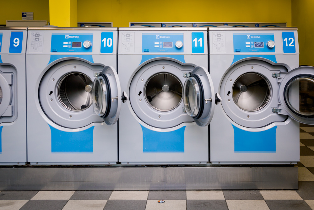 Legere Leichtigkeit trifft Buntwaschgang. Als Location haben wir uns einen quietschgelben Waschsalon mit baby-blauer Waschtrommelflotte ausgesucht und den Fliesenspiegel im Weitwinkel wirken lassen.